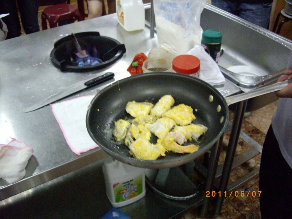 作法: 1. 海鮮依序粘麵粉,沾蛋液後煎微焦,送入烤箱烤熟備用.