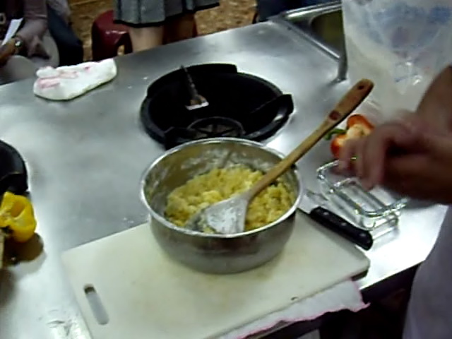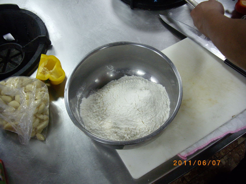 2. 蒜片2粒,洋葱碎,紅黃椒丁(配色用),洋菇片,白葡萄酒,鮮奶油,水,麵糊,芝士條,芝士粉.