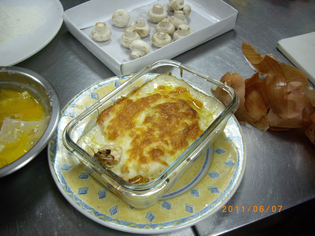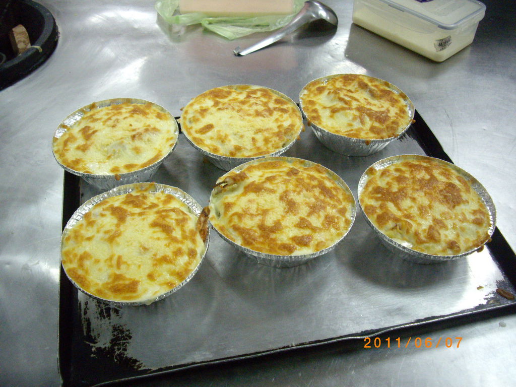 3. 先放少許2.的材料於烤碗中,再放入海鮮,再鋪上材料2,再鋪上芝士條,