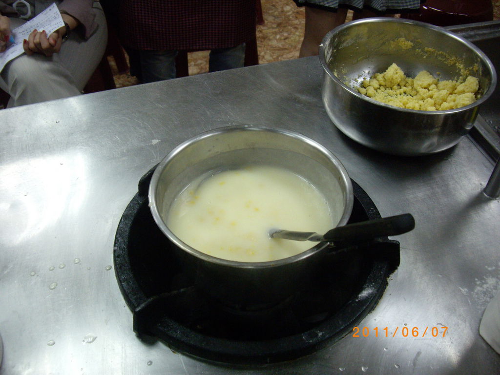 材料: 水500cc,鮮奶300cc,鮮奶油200cc,玉米粒&玉米醬各0.5罐,玉桂葉3片.調味料,麵糊.