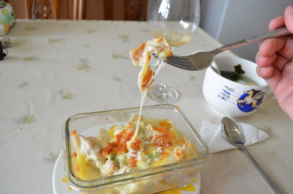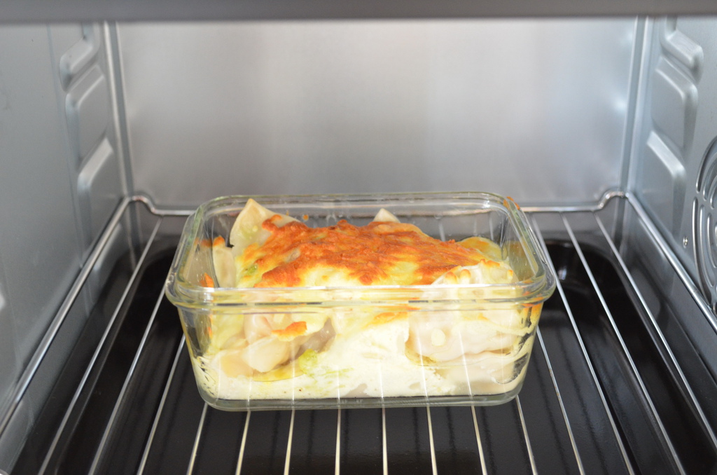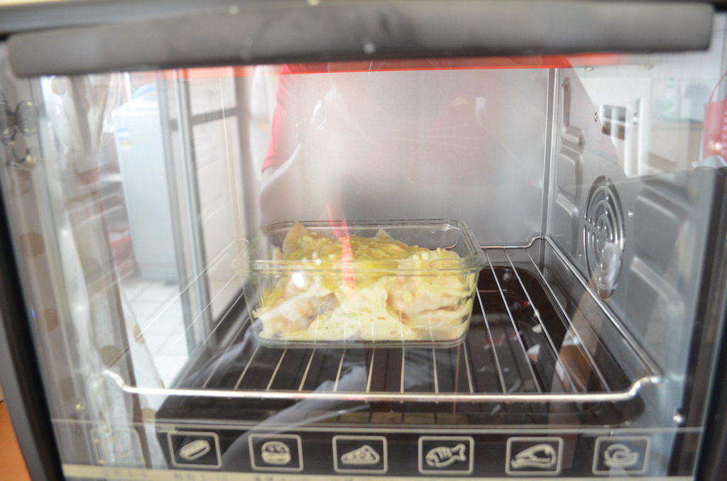 到入白醬再鋪上起司絲,送入烤箱,