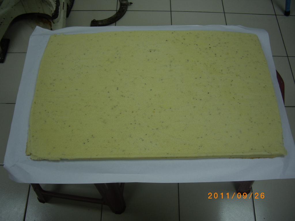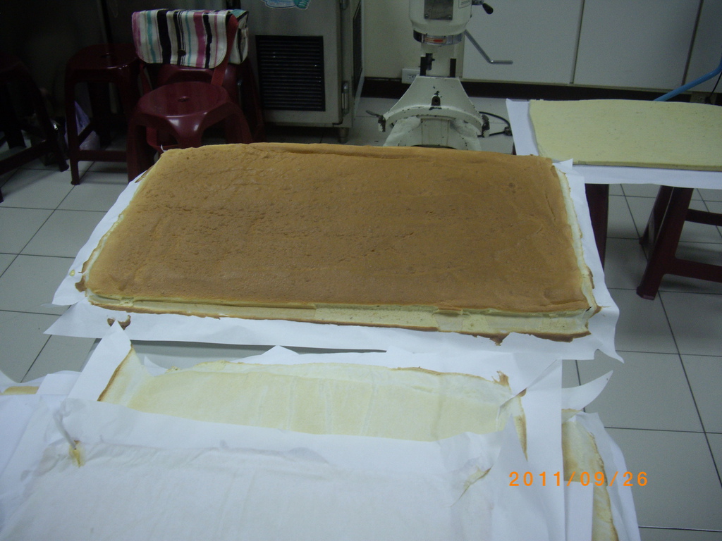 6. 將蛋糕體分切適當大小,抹上餡料,初折處劃兩三刀能較易折捲,捲時放於烤紙上,用像捲壽司方式即可,