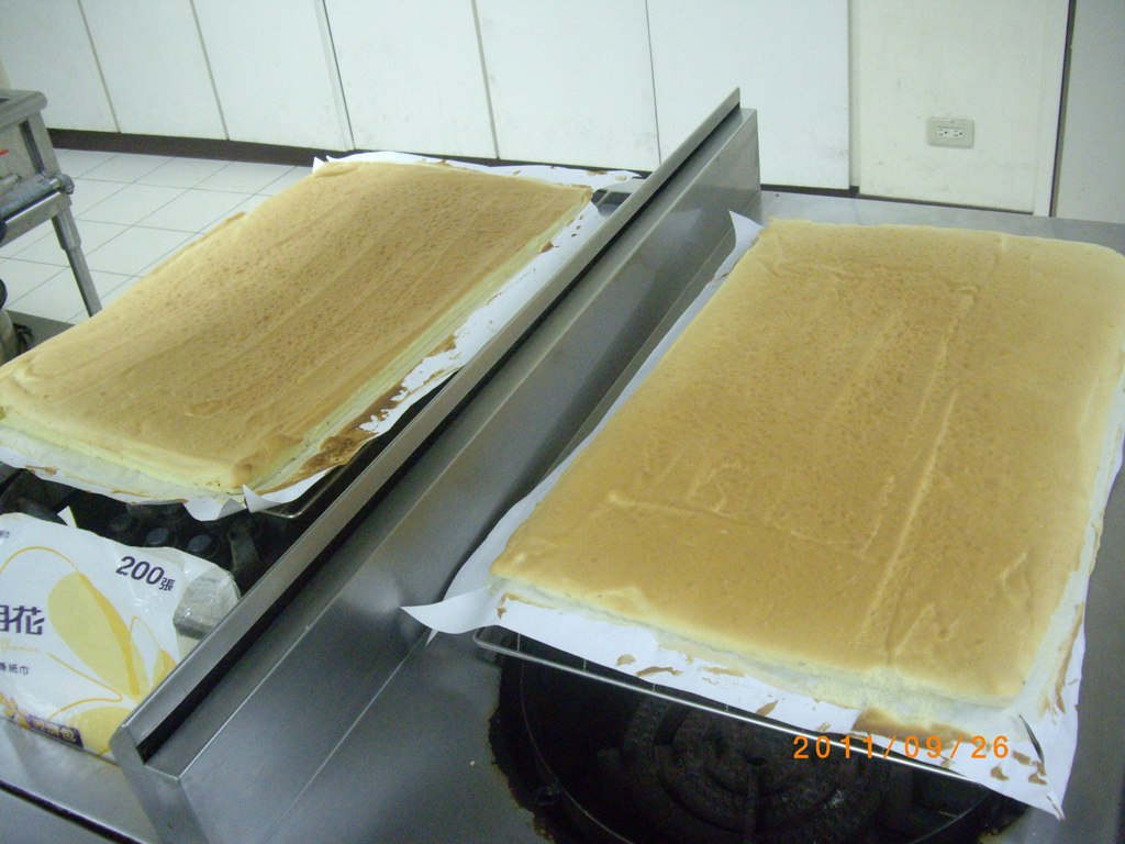 5. 烤好後隔空放涼蛋糕體,放至全冷表皮才不會因水氣黏著剝落,(直接風吹冷會造成蛋糕體收縮過多)