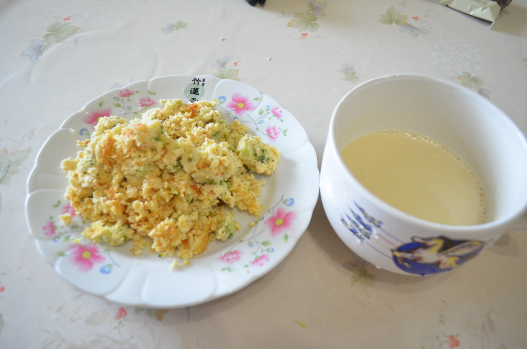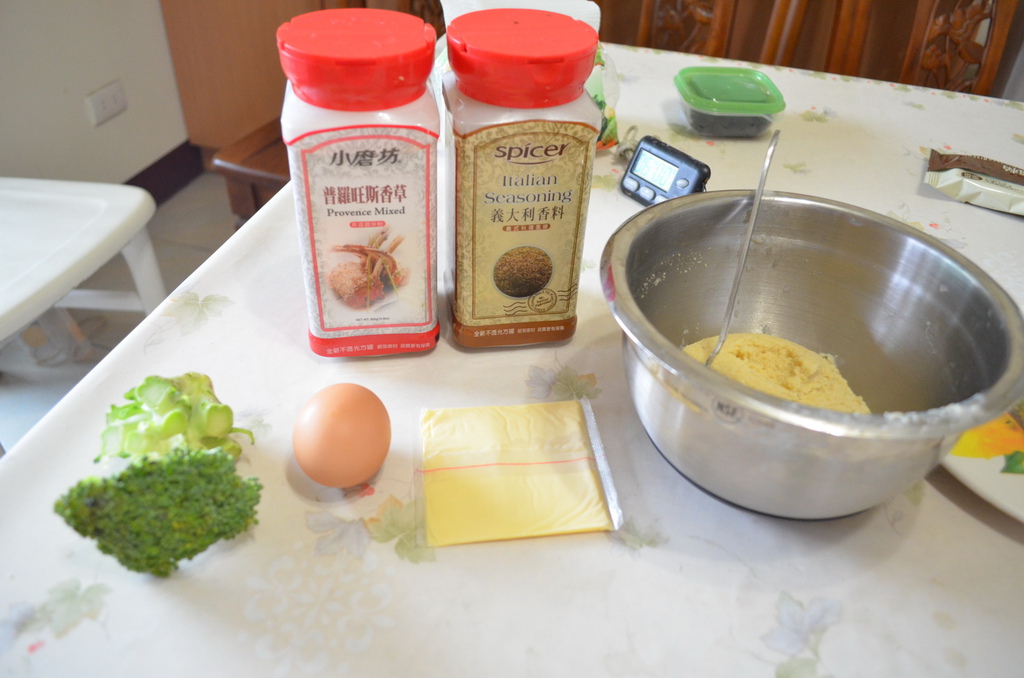 豆渣配置香料,起司弄小碎片,加花椰菜穗,雞蛋~拌勻
